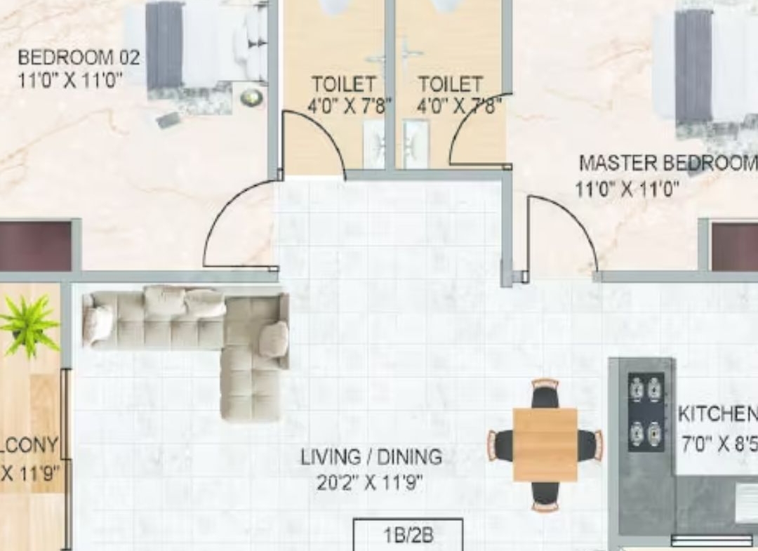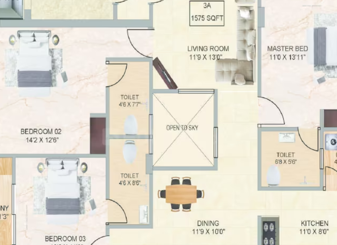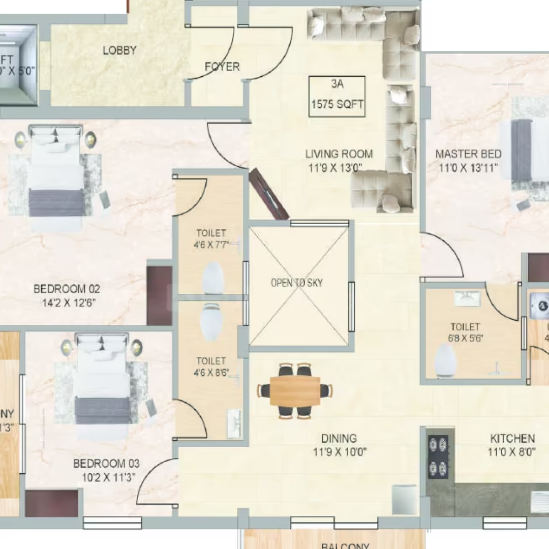 The apartments are available in 2 & 3 BHK configurations, with sizes ranging from 940 sq.ft. to 1575 sq.ft., making them ideal for both small and medium-sized families. Designed with efficient space utilization and modern layouts, each home provides comfort, ventilation, and functionality.